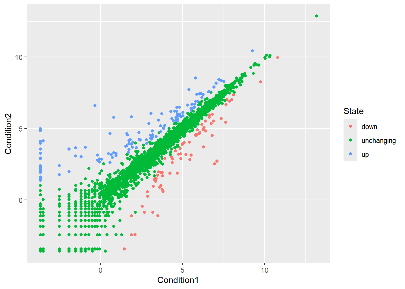Version 2 let’s color by State so we can see the “up” and “down” significant genes compared to all the “unchanging” genes