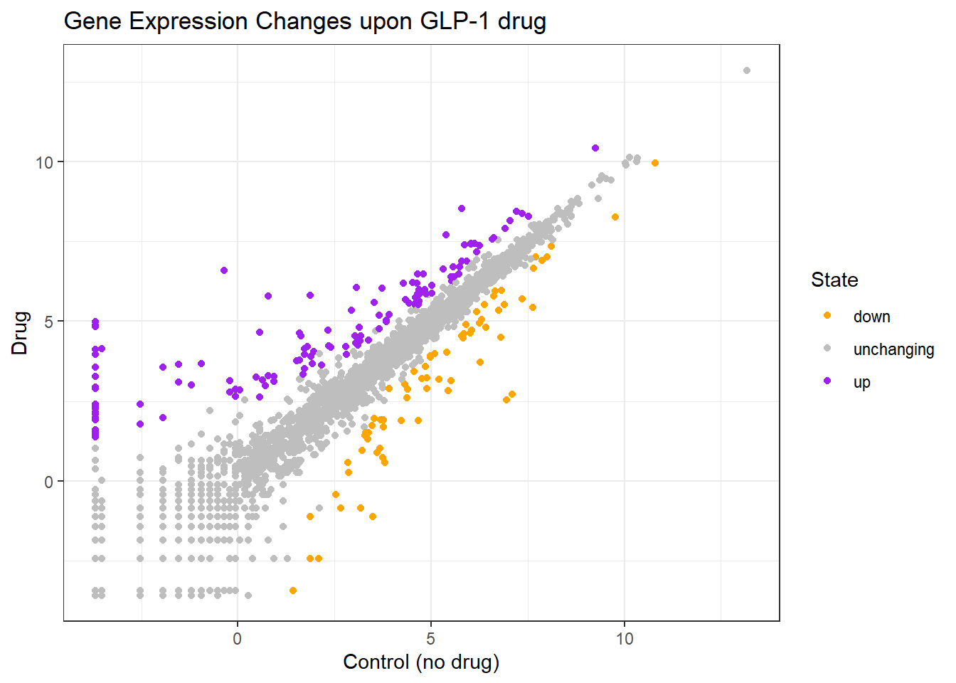 labs(x="Control (no drug)", y="Drug", title="Gene Expression Changes upon GLP-1 drug") +