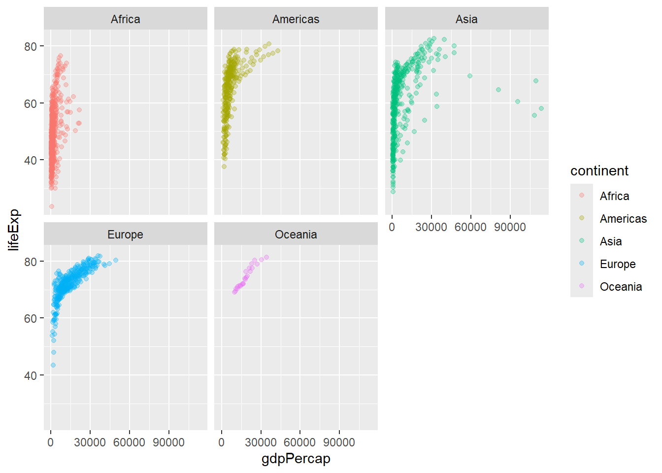 Let’s “facet” (i.e. make a separate plot) by continent rather than the big hot mess above.