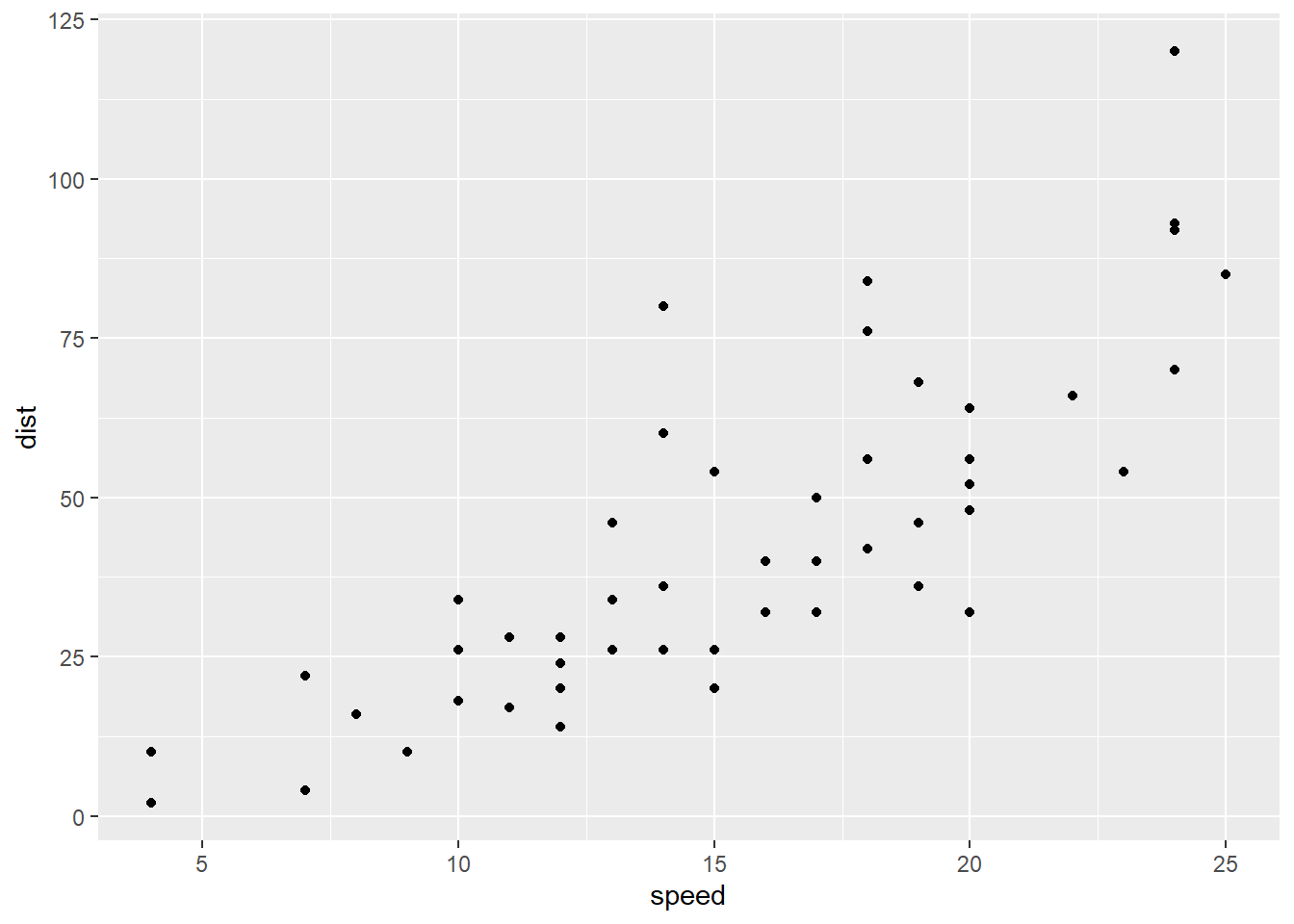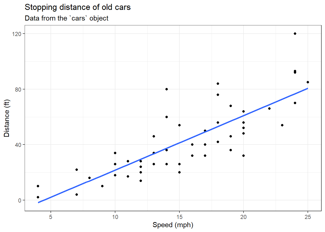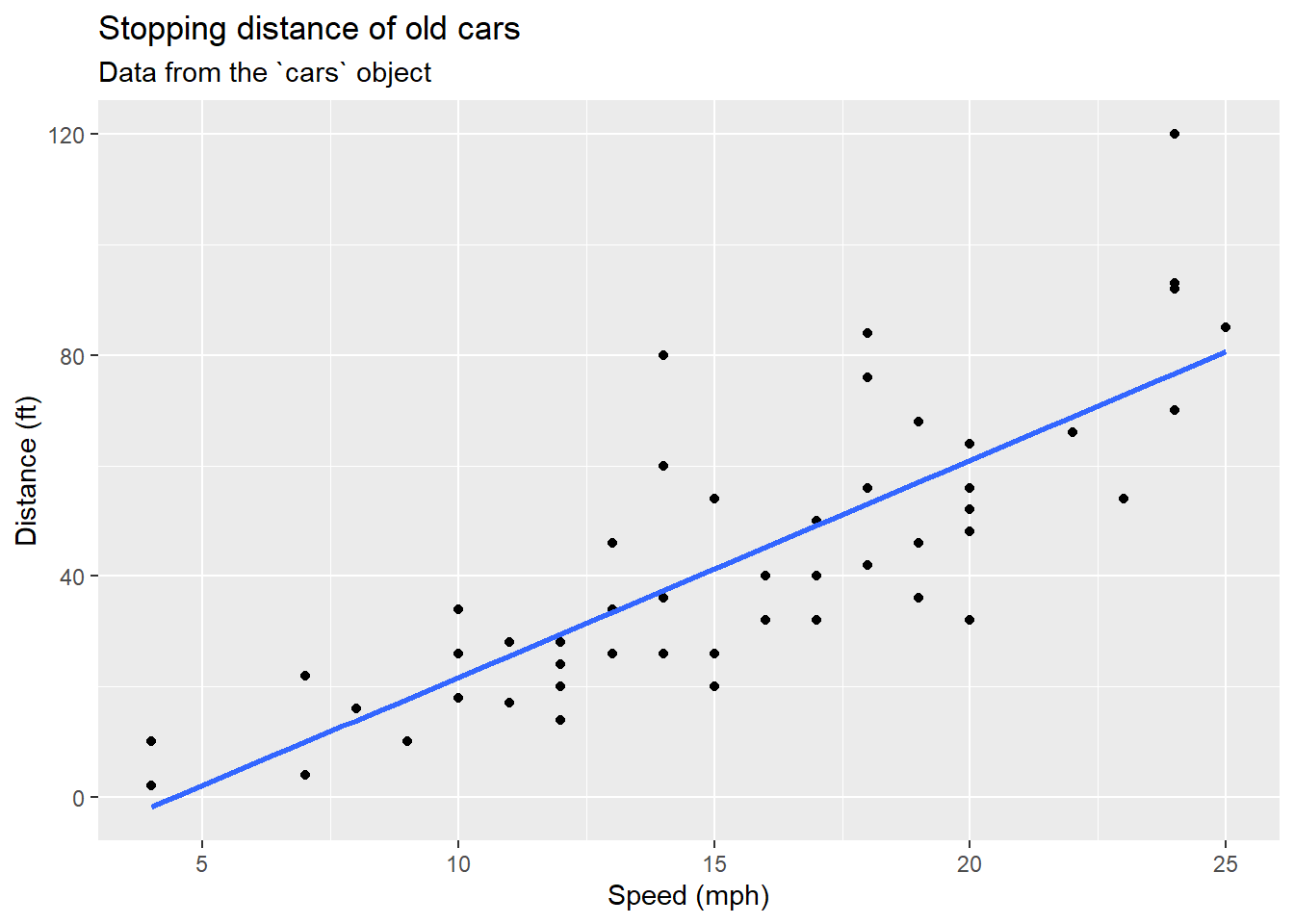 labs(title="Stopping distance of old cars", subtitle = "Data from the `cars` object", x="Speed (mph)", y="Distance (ft)")render it out
