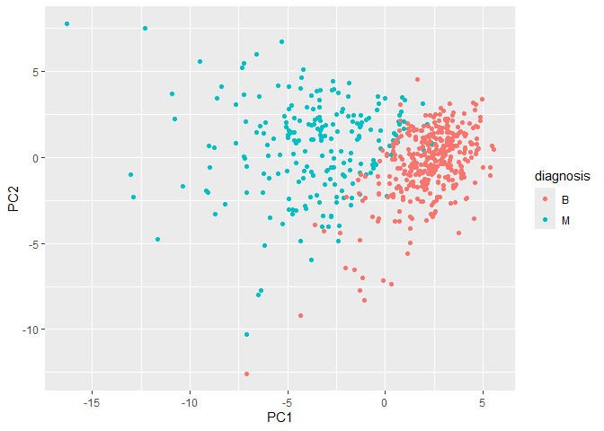 Collectively these two plot (“score plot” and “loadings plot”) tell us that if cells nucleus are deeply indented (“concave”), irregular non circular (“compactness”), and have large “perimeter” values they tend to be malignant…