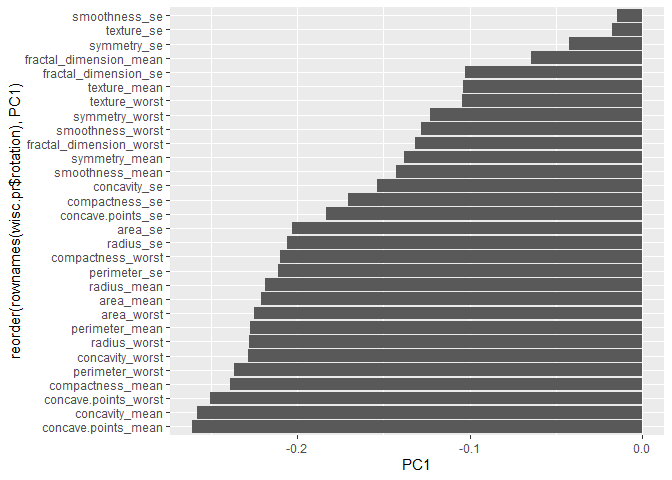 Q9. For the first principal component, what is the component of the loading vector (i.e. wisc.pr$rotation[,1]) for the feature concave.points_mean? This tells us how much this original feature contributes to the first PC. Are there any features with larger contributions than this one?