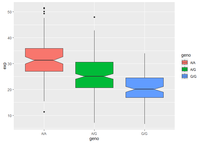 Q14: Generate a boxplot with a box per genotype, what could you infer from the relative expression value between A/A and G/G displayed in this plot? Does the SNP effect the expression of ORMDL3?